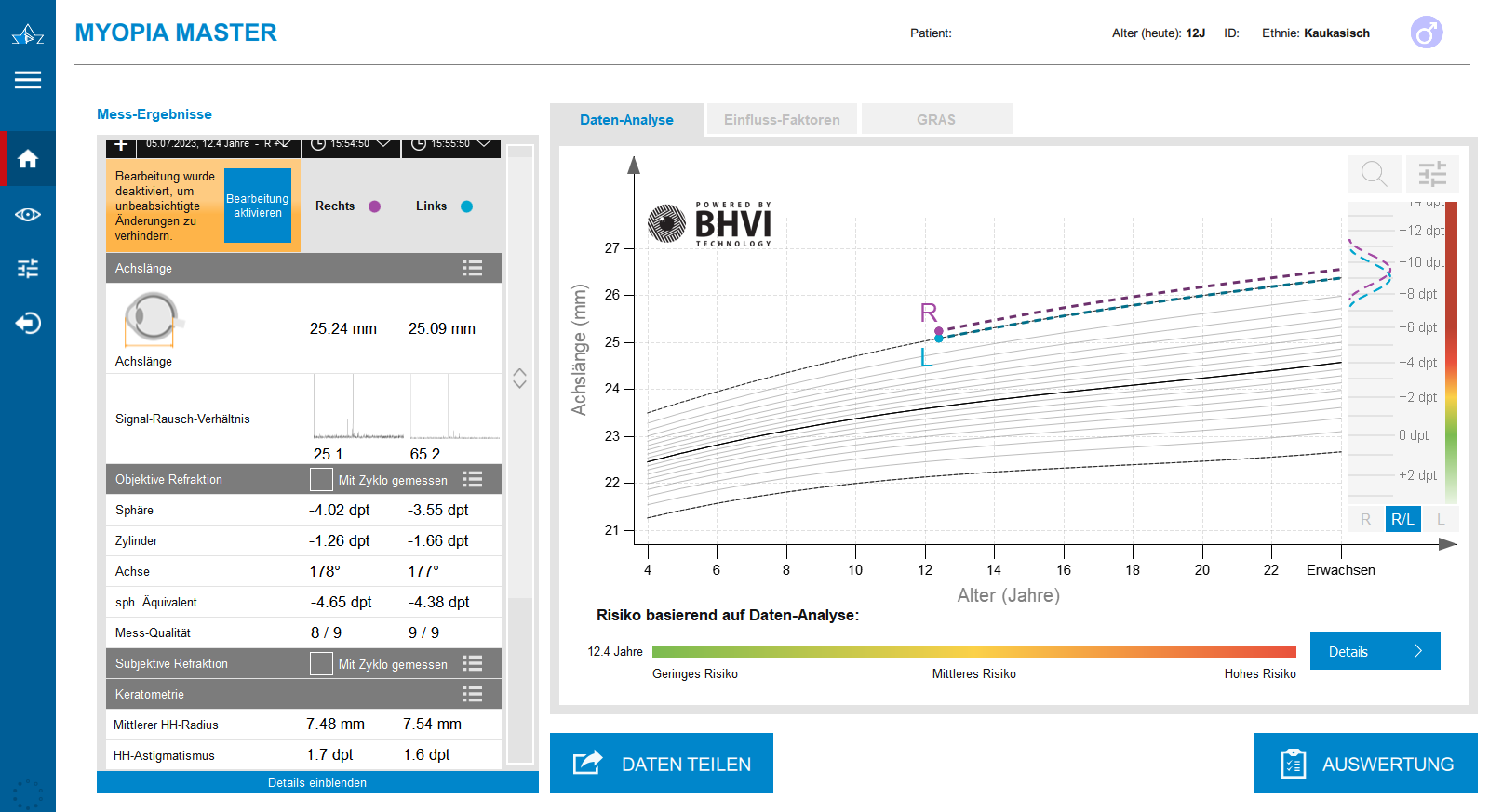 Andererseits müssen, speziell beim Myopie Management, die Auswirkungen der Korrektionsmittel auf die Augen und die Sehleistung überprüft werden. Dies erfolgt klassisch über eine Refraktion, um zu schauen ob sich eine Veränderung an den dioptrischen Werten ergeben hat.
